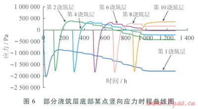圖5為各澆筑層底部某點(diǎn)環(huán)向應(yīng)力時(shí)程曲線,圖6為部分澆筑層底部某點(diǎn)豎向應(yīng)力時(shí)程曲線。由圖5可知,在LNG儲(chǔ)罐外罐施工期間,溫度應(yīng)力分為壓應(yīng)力發(fā)展、壓應(yīng)力轉(zhuǎn)變?yōu)槔瓚?yīng)力及拉應(yīng)力趨于殘余應(yīng)力3個(gè)階段。比較圖5和圖6可知,混凝土外罐在溫度及重力荷載作用下,第一主應(yīng)力為環(huán)向應(yīng)力,與彈性力學(xué)理論分析的結(jié)果相符,而且現(xiàn)場(chǎng)施工經(jīng)驗(yàn)表明混凝土外罐在施工期間底部經(jīng)常產(chǎn)生豎向裂縫。由圖5還可知,第1澆筑層所受的溫度應(yīng)力明顯大于其他澆筑層,產(chǎn)生這種狀況的原因是第1澆筑層混凝土受到罐底的約束度相對(duì)較大;因第3~9澆筑層澆筑高度及約束狀況相近,所以其應(yīng)力變化曲線相似;第10澆筑層環(huán)向應(yīng)力曲線因受環(huán)梁澆筑的影響而產(chǎn)生2MPa的應(yīng)力波動(dòng)。