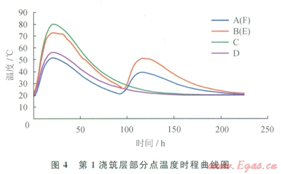 第1澆筑層部分點(diǎn)溫度時(shí)程曲線如圖4所示。由圖4可知,在外界恒溫條件下,混凝土內(nèi)部溫度在其澆筑約ld后迅速達(dá)到峰值,之后開(kāi)始緩慢降溫,在其澆筑約10d后趨于穩(wěn)定。由圖4還可知,外罐罐壁厚度中心最高升溫約為60℃,混凝土易產(chǎn)生深層裂縫;混凝土內(nèi)部與表面溫差為25℃,混凝土表面具有開(kāi)裂的危險(xiǎn);頂部}昆凝土塊內(nèi)部溫度受上層新澆筑混凝土的影響比較大。因此A、B測(cè)點(diǎn)在溫度下降階段有20~30℃的溫度波動(dòng),數(shù)值分析表明,新澆筑混凝土對(duì)下層混凝土的影響深度約為1.2m。