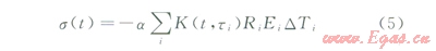 式(5)對(duì)應(yīng)于第i時(shí)間段,a為混凝土熱膨脹系數(shù),1/℃;K(ti,t)為應(yīng)力松弛系數(shù);Ri為約束系數(shù),其值與構(gòu)件長(zhǎng)高比及混凝土彈性模量比有關(guān);Ei為彈性模量,MPa;DTi為混凝土的內(nèi)外溫差,℃。