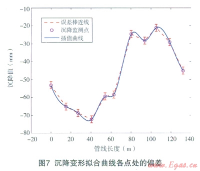 在本次試驗(yàn)中,由于監(jiān)測(cè)時(shí)間較短,在整個(gè)監(jiān)測(cè)時(shí)間段內(nèi)管道沒(méi)有發(fā)生大的實(shí)際變形,所以小的變形量就導(dǎo)致了比較大的相對(duì)誤差。為了考察大變形下誤差對(duì)計(jì)算結(jié)果的影響,不妨把管道的沉降測(cè)量值增大10倍。以第2個(gè)月的監(jiān)測(cè)值作為算例,利崩Matlab進(jìn)行30次的隨機(jī)數(shù)生成,其沉降變形擬合曲線的偏差范圍如圖7。