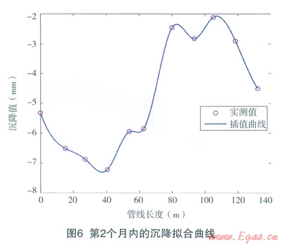 通過(guò)Matlab軟件,可容易地對(duì)沉降值進(jìn)行三次樣條擬合,以第2個(gè)月內(nèi)的沉降監(jiān)測(cè)點(diǎn)為例,進(jìn)行曲線插值擬合,結(jié)果曲線如圖6。