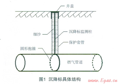 為掌握埋地燃?xì)夤艿赖某两敌畔?,結(jié)合燃?xì)夤艿朗┕?,在管道頂部安裝了沉降標(biāo)進(jìn)行監(jiān)測(cè)。現(xiàn)場(chǎng)沉降標(biāo)由圓形抱箍、不銹鋼監(jiān)測(cè)柱、保護(hù)套管及井蓋構(gòu)成,圓形抱箍圍住管道并用螺絲同定,不銹鋼監(jiān)測(cè)柱焊接在抱箍正上方并伸出至接近地面,監(jiān)測(cè)柱外側(cè)設(shè)置保護(hù)套管,套管頂部設(shè)有保護(hù)井蓋。沉降標(biāo)具體結(jié)構(gòu)見(jiàn)圖1,通過(guò)對(duì)不銹鋼柱沉降的測(cè)量反映管道的沉降。