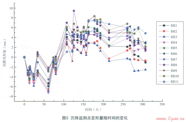 整個(gè)實(shí)驗(yàn)系統(tǒng)安裝完畢后即開(kāi)始運(yùn)行,截至目前的300天時(shí)間內(nèi),沉降數(shù)據(jù)的采集頻率由人工操作,大約為20天1次,各沉降監(jiān)測(cè)點(diǎn)的監(jiān)測(cè)結(jié)果如圖5。