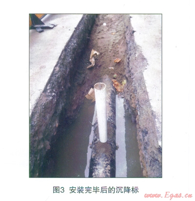 沉降標(biāo)在管道施工的同時(shí)進(jìn)行安裝,有專業(yè)的安裝施工隊(duì)進(jìn)行,保證監(jiān)測(cè)的準(zhǔn)確性。沉降標(biāo)的安裝見(jiàn)圖3所示。