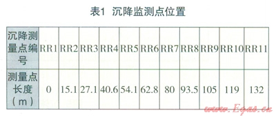 整個(gè)測(cè)試管道沉降測(cè)量點(diǎn)的編號(hào)與水平方向的長(zhǎng)度見(jiàn)表1所示。