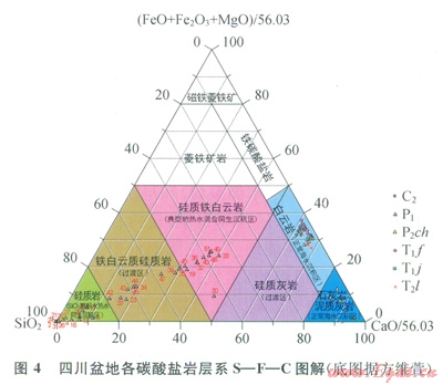 方維萱[7]提出S—F—C圖解。C端元(CaO)代表正常海水的沉積作用形成的碳酸鹽巖,S端元(SiO2)代表以SiO2為酸酐的熱水同生沉積作用形成的硅質(zhì)巖,F端元(FeO+Fe2O3+MgO)代表富Fe、Mg碳酸鹽型熱水同生沉積作用形成的菱鐵礦巖。川東地區(qū)所有中二疊統(tǒng)層狀硅質(zhì)巖、硅質(zhì)白云巖、白云巖樣品均落在硅質(zhì)鐵白云巖(典型的熱水混合同生沉積區(qū))、硅質(zhì)巖(SiO2酸酐型熱水同生沉積區(qū))及鐵白云質(zhì)硅質(zhì)巖(過渡區(qū))內(nèi),而四川盆地石炭系、長興組、飛仙關組、嘉陵江組和雷口坡組的樣品則落在正常海水沉積區(qū)(圖4)。S—F—C圖解顯示中二疊統(tǒng)層狀硅質(zhì)巖、白云巖、硅質(zhì)白云巖成因與其他層系的白云巖成因截然不同,為熱水成因。