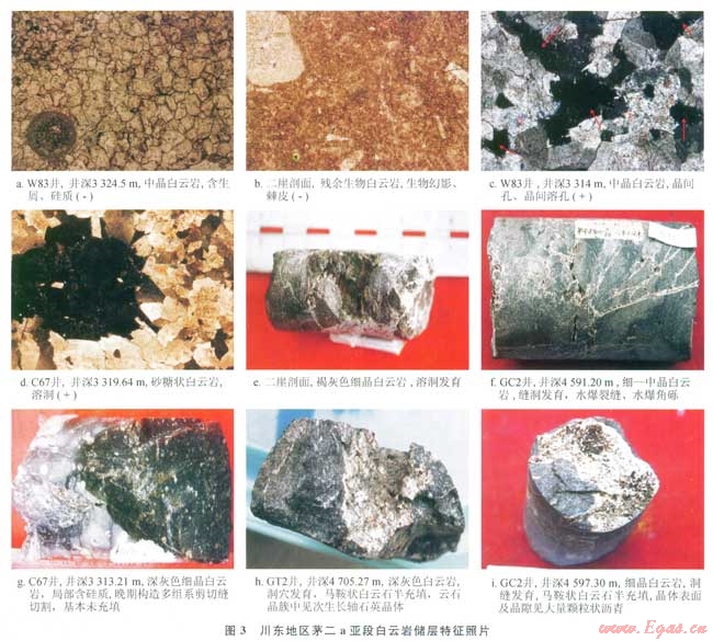 1)川東地區(qū)茅二a亞段發(fā)育一套層狀、硅質(zhì)白云巖儲層,厚度可達30m,儲層溶蝕孔洞縫發(fā)育,儲集性能好。