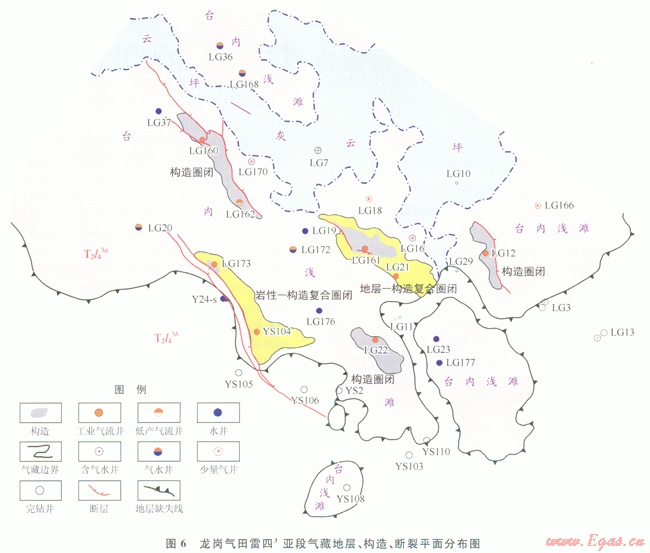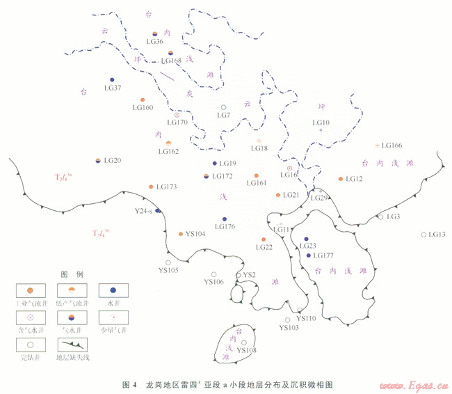 3)在大型地層尖滅的背景上,受構(gòu)造、斷層和巖性變化影響,發(fā)育地層 構(gòu)造、巖性一構(gòu)造等多種圈閉類(lèi)型。雷四3亞段a小段尖滅帶附近的次級(jí)巖溶斜坡是尋找工業(yè)氣井的最有利區(qū)。