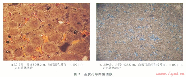 儲(chǔ)層基質(zhì)孔隙類(lèi)型有粒間溶孔、晶間溶孔、粒內(nèi)溶孔、鑄??缀腕w腔孔,其中粒間溶孔、晶間溶孔是主要的孔隙類(lèi)型,其發(fā)育程度直接影響到儲(chǔ)層的儲(chǔ)集能力。