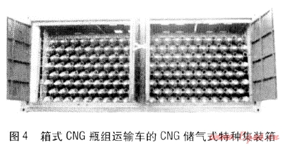 ③ 箱式CNG瓶組運(yùn)輸車由箱式貨車、CNG儲氣式特種集裝箱(見圖4)組成。