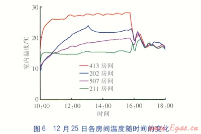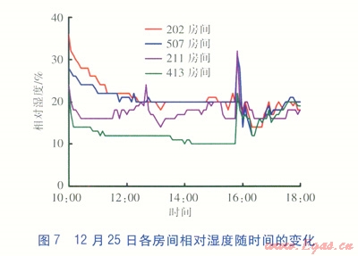 12月25日室內(nèi)溫度從l0:00的15.69℃上升至15:45的28.06℃,之后開始下降。截至18:00,室內(nèi)溫度為16.81℃。房間相對(duì)濕度很低,約l0%左右,至l5:50開始相對(duì)濕度突然有所增加,并逐步上升到20%。