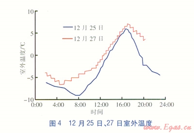 由此可見,在正常晴朗天氣下,ll:O0至l8:00,不啟動(dòng)風(fēng)機(jī)盤管,僅依靠太陽能輻射取暖基本可滿足供暖需求。當(dāng)遇到陰雨天氣時(shí),室內(nèi)溫度急劇下降,需開啟供暖設(shè)施。