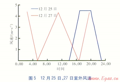 12月25日、27日逐時(shí)室外溫度、風(fēng)速分別見圖4、5。由圖4、5可知,測試日室外溫度變化趨勢基本一致。最高室外溫度均出現(xiàn)在16:40左右,25日、27日最高室外溫度分別為5.9、6.6℃。日最低室外溫度基本出現(xiàn)在8:00前后,25日、27日最低室外溫度分別為-9.07、-8.03℃。25日14:O0之后開始起風(fēng),風(fēng)速在16:00左右升至4.5m/s;27日全天風(fēng)速變化范圍0~4.5m/s。由實(shí)測結(jié)果可知,25日、27日室外空氣相對(duì)濕度變化范圍分別為6.04%~24.26%、5.52%~19.38%。