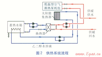 該建筑為拉薩市某多層辦公建筑,建筑共5層,總建筑面積為7500m2,辦公建筑典型層的平面布置見圖1。供暖方式采用以太陽能熱水系統(tǒng)為主、空氣源熱泵為輔的形式,室內(nèi)供暖裝置為風(fēng)機(jī)盤管。供暖室內(nèi)設(shè)計(jì)溫度為20℃,供、回水溫度為45、40℃。供熱系統(tǒng)流程見圖2。乙二醇水溶液經(jīng)過太陽能集熱器(平板形)加熱后進(jìn)入蓄熱水箱,蓄熱水箱出水經(jīng)板式換熱器與供暖回水換熱。若換熱后的水溫低于45℃,低溫型空氣源熱泵啟動(dòng),將水溫加熱至45℃后供給末端風(fēng)機(jī)盤管;若換熱后的水溫達(dá)到45℃,低溫型空氣源熱泵不啟動(dòng),熱水直接供給末端風(fēng)機(jī)盤管。