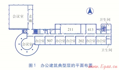 選擇4個(gè)房間(位置見圖l)進(jìn)行室內(nèi)熱環(huán)境監(jiān)測,被測房間分別為:南向202、507房間,建筑面積均為64m2;北向211、413房間,建筑面積分別為124、64m2。規(guī)定507房間不開啟風(fēng)機(jī)盤管,其他房間均可開啟風(fēng)機(jī)盤管供暖。