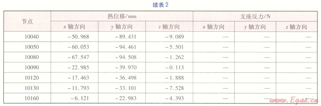 輸入數(shù)據(jù):熱水溫度130℃,設(shè)計(jì)壓力1.6MPa,管材Q2358,管道外直徑1220mm,直管壁厚16mm,彎頭壁厚18mm。其他參數(shù)可通過(guò)AutoPSA應(yīng)力分析軟件,實(shí)現(xiàn)手動(dòng)調(diào)用或自動(dòng)調(diào)用。建立好的計(jì)算模型經(jīng)AutoPSA應(yīng)力分析軟件分析計(jì)算,得到一次應(yīng)力、二次應(yīng)力、熱位移、支座反力。應(yīng)力驗(yàn)算結(jié)果見(jiàn)表1,熱位移、支座反力見(jiàn)表2。由表1可知,供熱管道各單元的一次應(yīng)力、二次應(yīng)力均滿足《規(guī)范》要求。表2數(shù)據(jù)可作為結(jié)構(gòu)專(zhuān)業(yè)設(shè)計(jì)桁架的基礎(chǔ)數(shù)據(jù),表中負(fù)號(hào)表示方向與坐標(biāo)軸正向相反。