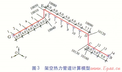 架空供熱管道計(jì)算模型見(jiàn)圖3,圖中數(shù)值單位為m。其中節(jié)點(diǎn)1、14為固定支架,節(jié)點(diǎn)2~13為滑動(dòng)支架,節(jié)點(diǎn)l0010、10040、10050、10080、10090、10120、10130、10160為彎頭應(yīng)力計(jì)算節(jié)點(diǎn)。