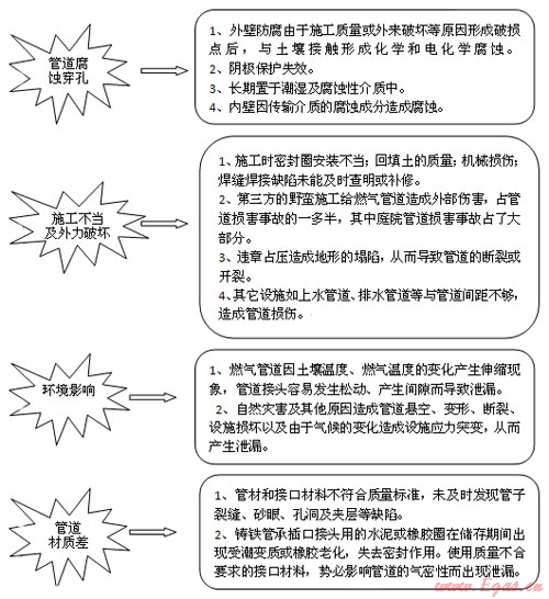 燃?xì)夤艿劳度脒\行后,因腐蝕、管道接口、密封材料老化、安裝質(zhì)量不良、機械振動、管道的熱脹冷縮等原因,產(chǎn)生穿孔、裂縫或斷裂造成燃?xì)庑孤?。燃?xì)庑孤┮院?,會沿著一定的通道傳播到地面或建?gòu)筑物內(nèi),當(dāng)泄漏的燃?xì)膺_(dá)到爆炸極限,遇火源則產(chǎn)生火災(zāi)、爆炸和一系列次生災(zāi)害,導(dǎo)致嚴(yán)重的人員傷亡和財產(chǎn)損失。