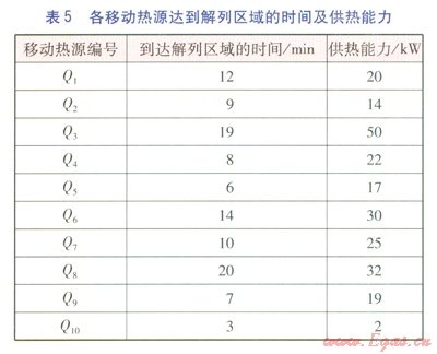 移動熱源(Q1~Q10)至解列區(qū)域M的出救路線見圖4。各移動熱源達(dá)到解列區(qū)域的時間及供熱能力見表5。設(shè)解列區(qū)域的最低限額供熱量為50kW,考慮移動熱源到達(dá)解列區(qū)域時間以及式(2),得到出救移動熱源順序?yàn)?/span>Q10、Q5、Q9、Q4,即解列區(qū)域恢復(fù)供熱的最短時間為8min??紤]移動熱源供熱能力后,最優(yōu)出救移動熱源順序?yàn)?/span>Q5、Q9、Q4,此時解列區(qū)域恢復(fù)供熱的最短時間仍為8min。由算例可知,通過優(yōu)化在出救時間最短標(biāo)準(zhǔn)不變的條件下,出救移動熱源數(shù)量減少,從而提高了移動熱源出救的經(jīng)濟(jì)性。