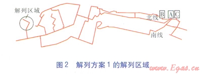 按照解列最不利熱用戶的原則,并根據(jù)閥門設(shè)置情況,選取解列方案1、2。兩種解列方案中解列區(qū)域分別見圖2、3。解列方案1、2的解列區(qū)域分別包括15、34個熱用戶,被解列熱用戶總設(shè)計質(zhì)量流量分別為1030、2220t/h。解列區(qū)域最低限額供熱系數(shù)仍取0.807,則解列方案1、2的解列區(qū)域事故工況下的質(zhì)量流量分別為832、1792t/h。