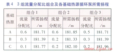 根據(jù)各基礎(chǔ)熱源設(shè)計質(zhì)量流量,經(jīng)計算可得,基礎(chǔ)熱源A~C的流量分配比限額(最大值)分別為0.6、0.3、0.2。在南線出口事故工況下,按照10%步長改變各基礎(chǔ)熱源流量分配比,可得到3組流量分配比組合。按照文獻(xiàn)[8]的計算方法,分別計算3組流量分配比組合中各基礎(chǔ)熱源循環(huán)泵所需揚(yáng)程。3組流量分配比組合及各基礎(chǔ)熱源循環(huán)泵所需揚(yáng)程見表4。