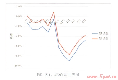 (4)全年表1的誤差為-4.6%左右,表2的誤差為-3.3%左右。表1、表2的平均誤差在-4%左右。此誤差遠(yuǎn)大于其±1.5%的允許誤差,因此可以認(rèn)為氣候條件是造成誤差的主要因素。