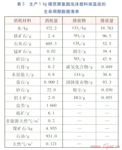 建材的含能(Embodied Energy)近年來(lái)在國(guó)外得到廣泛研究,含能是指產(chǎn)品從自然界原始材料的掘取,經(jīng)過(guò)運(yùn)輸、加工、組裝直至成品出廠前的所有相關(guān)過(guò)程的能耗總和,是基于生命周期的能耗統(tǒng)計(jì)數(shù)據(jù)。顧道金[14]利用國(guó)外含能數(shù)據(jù),建立了中國(guó)建筑產(chǎn)品外推含能數(shù)據(jù)表,并計(jì)算了我國(guó)能源使用背景下lMJ含能的生命周期數(shù)據(jù)清單。對(duì)于保溫層、外護(hù)管,在計(jì)算環(huán)境影響時(shí)都采用此種方法,生產(chǎn)1kg硬質(zhì)聚氨酯泡沫塑料保溫層、高密度聚乙烯外護(hù)管的生命周期數(shù)據(jù)清單(關(guān)鍵數(shù)據(jù))分別見(jiàn)表3、4。
