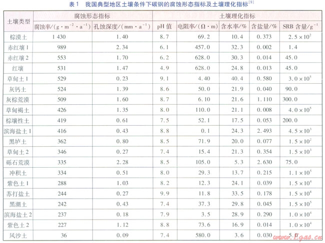 埋地鋼質(zhì)燃?xì)夤艿赖母g形態(tài)分為全面腐蝕、局部腐蝕兩類,全面腐蝕是指與土壤相接觸的管道表面均因腐蝕而受到損耗,以腐蝕率表示;局部腐蝕是指腐蝕的發(fā)生局限在結(jié)構(gòu)特定區(qū)域或部位上,以孔蝕深度進(jìn)行評(píng)價(jià)。本文給出的我國典型地區(qū)土壤對(duì)碳鋼的腐蝕形態(tài)指標(biāo)及土壤理化指標(biāo),來自埋沒于國內(nèi)20個(gè)典型地區(qū)土壤的碳鋼試驗(yàn)件1a的腐蝕數(shù)據(jù)及土壤理化性質(zhì),實(shí)測(cè)數(shù)據(jù)與實(shí)際情況接近。