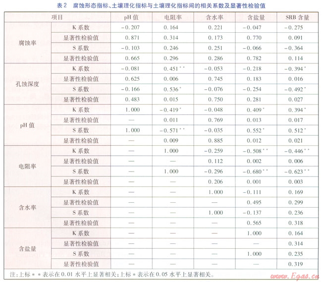 依據(jù)表1中20組樣本數(shù)據(jù),計(jì)算得出腐蝕形態(tài)指標(biāo)與土壤理化指標(biāo)間的相關(guān)系數(shù),所得相關(guān)系數(shù)絕對(duì)值越大,相關(guān)性越強(qiáng),當(dāng)求得的相關(guān)系數(shù)絕對(duì)值大于相關(guān)系數(shù)雙側(cè)檢驗(yàn)臨界值時(shí),變量間顯著相關(guān)(相關(guān)系數(shù)為正,變量顯著正相關(guān);相關(guān)系數(shù)為負(fù),變量顯著負(fù)相關(guān)),否則不相關(guān)。