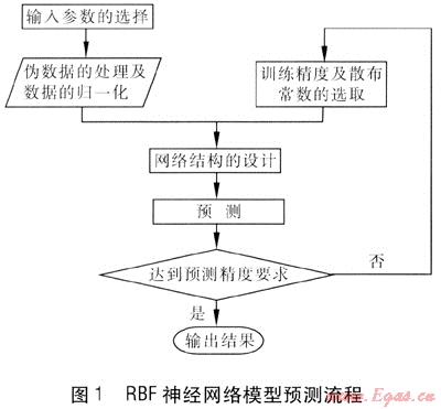 RBF網(wǎng)絡(luò)和普通的前向網(wǎng)絡(luò)有所不同,隱層神經(jīng)元是徑向基神經(jīng)元而不是tansig或者logsig神經(jīng)元。普通前向網(wǎng)絡(luò)中sigmoid神經(jīng)元能夠覆蓋較大的輸入?yún)^(qū)域,但是普通前向神經(jīng)元數(shù)目在訓(xùn)練前就已經(jīng)固定下來。而徑向基神經(jīng)元雖然只對相對較小的區(qū)域產(chǎn)生響應(yīng),但是在輸入?yún)^(qū)間較大時,可以適當(dāng)?shù)卦黾訌较蚧窠?jīng)元來調(diào)整網(wǎng)絡(luò),從而達(dá)到精度要求。且RBF網(wǎng)絡(luò)的設(shè)計比普通前向網(wǎng)絡(luò)訓(xùn)練要省時得多[6]。RBF網(wǎng)絡(luò)模型預(yù)測流程見圖1。