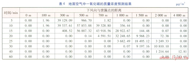 泄漏條件:一氧化碳的泄漏質(zhì)量流量為0.76kg/s,泄漏持續(xù)時(shí)間為10min,泄漏點(diǎn)高度為3m,每10s釋放一個(gè)煙團(tuán)。氣象條件:風(fēng)速為1.8m/s,大氣穩(wěn)定度為D級(jí)。采用多煙團(tuán)模式預(yù)測(cè)方式的預(yù)測(cè)結(jié)果見表4。根據(jù)預(yù)測(cè)結(jié)果,可分析不同時(shí)刻下風(fēng)向地面空氣中一氧化碳質(zhì)量濃度超標(biāo)距離范圍。