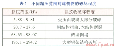 由沖擊波一沖量準(zhǔn)則確定的不同超壓范圍對(duì)建筑物的破壞程度、人體的傷害程度分別見表1、2。