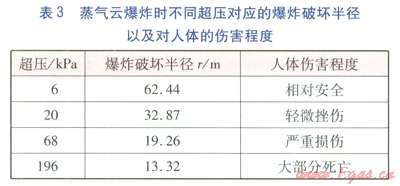以建筑物破壞程度作為基準(zhǔn),超壓選取不同建筑物破壞程度對(duì)應(yīng)的超壓最小值(并進(jìn)行圓整),由式(1)、(2)計(jì)算壓縮機(jī)房泄漏焦?fàn)t煤氣發(fā)生蒸氣云爆炸時(shí),不同超壓對(duì)應(yīng)的爆炸破壞半徑,并判定對(duì)人體傷害程度,見表3。