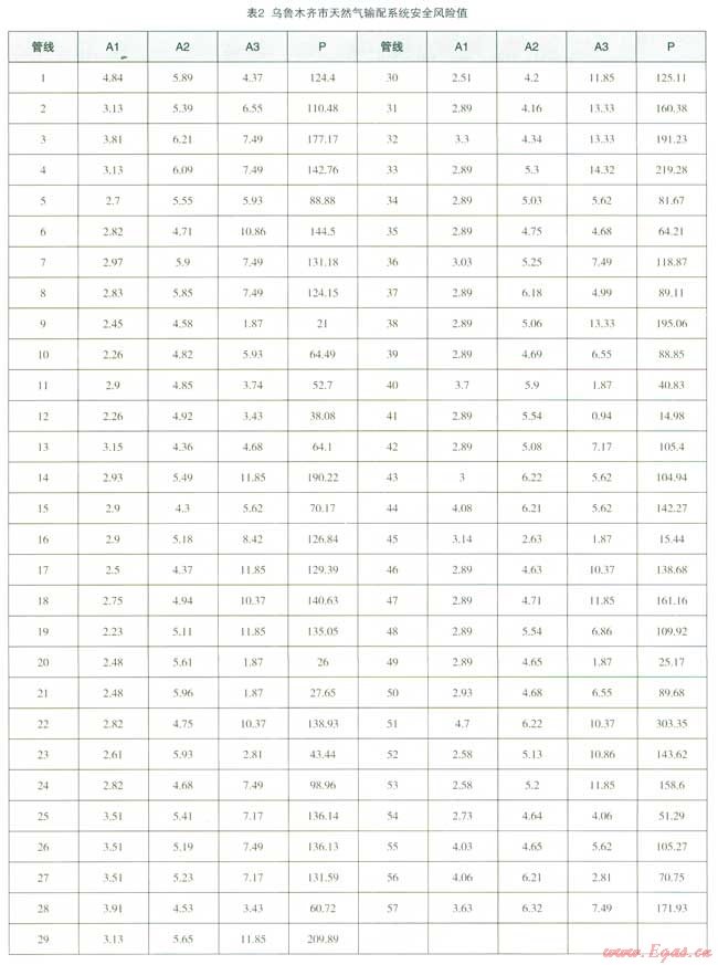 根據(jù)風(fēng)險(xiǎn)評(píng)估方法,計(jì)算出烏魯木齊市57條滅然氣管道的風(fēng)險(xiǎn)值(表2)。由表2可知,管網(wǎng)脆弱性指標(biāo)以1號(hào)管線最大,為4.84,其次是51號(hào)管線,為4.70,主要是因?yàn)楣芫€管輸氣體壓力大,管線使用年限較長(zhǎng),19號(hào)管線管輸氣體壓力小,最小埋深大管網(wǎng)脆弱性指標(biāo)最小,為2.23。事故誘因指標(biāo)以57號(hào)管線最大,為6.32,其次是51號(hào)管線,為6.22,主要是因?yàn)榻ㄖ┕ぁ⒌孛婊顒?dòng)情況和供水、排水沒(méi)施建設(shè)活動(dòng)較頻繁,15號(hào)管線位于郊區(qū),外界干擾少,事故誘因指標(biāo)最小,為2.63。事故后果指標(biāo)以3,號(hào)管線最大,為14.32,其次是38號(hào)管線,為13.33,主要是因?yàn)槿細(xì)夤芫W(wǎng)位于居住區(qū)、商業(yè)區(qū)內(nèi),人口密度和財(cái)產(chǎn)密度較高,泄漏危害嚴(yán)重;41號(hào)管線位于人煙稀少地區(qū),事故后果指標(biāo)最小,為0.94。全部管網(wǎng)風(fēng)險(xiǎn)平均值為112,1條天然氣管道風(fēng)險(xiǎn)評(píng)估值大于300,說(shuō)明有較高的風(fēng)險(xiǎn);2條天然氣管道風(fēng)險(xiǎn)評(píng)估值在200~300之間,說(shuō)明風(fēng)險(xiǎn)一般;54條天然氣管道風(fēng)險(xiǎn)值小于200,說(shuō)明相對(duì)安全。綜合以上,由于管道周?chē)\(yùn)行環(huán)境不同,其風(fēng)險(xiǎn)也是不一樣的,51號(hào)管段的脆弱性指標(biāo)、事故誘因指標(biāo)和事故后果指標(biāo)較大,知此管段的風(fēng)險(xiǎn)等級(jí)較高。