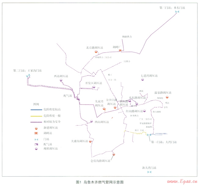 烏魯木齊城市燃?xì)夤芫W(wǎng)經(jīng)過(guò)十幾年的規(guī)劃、改造、建設(shè),形成了現(xiàn)在的燃?xì)饩W(wǎng)絡(luò)(圖1),烏魯術(shù)齊市天然氣覆蓋區(qū)域逐漸從以天、沙、新、水、米東5個(gè)主城區(qū)為主,延伸至頭屯河區(qū)、達(dá)坂城等城郊區(qū)域,已全面實(shí)現(xiàn)氣化目標(biāo),成為首個(gè)率先實(shí)現(xiàn)全面“氣化”的省會(huì)城市。