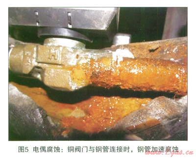 在金屬活動(dòng)順序表中,Fe要比Cu活潑,在相同的環(huán)境中,Fe的電位要比Cu負(fù)。當(dāng)異種金屬相接觸,處于相互連通的電解質(zhì)中時(shí),由于不同金屬之間存在實(shí)際電位差而使電位較低的金屬腐蝕速度比原來(lái)增大,電位較高的金屬的腐蝕速度減小,這種現(xiàn)象稱為電偶腐蝕[4],見(jiàn)圖5所示。當(dāng)鋼與銅相互接觸時(shí),鋼的腐蝕速率比其單獨(dú)存在時(shí)加大。在閥門位置,利用銅包鋼或者銅網(wǎng)進(jìn)行接地時(shí),由于電偶腐蝕的作用,會(huì)加速閥門的腐蝕。同時(shí)由于銅的良好導(dǎo)電性和自腐蝕較低的特性,利用銅材質(zhì)進(jìn)行接地時(shí),接觸電阻要比閥門直接接地更低,在這種情況下,陰極保護(hù)電流集中流入流出的現(xiàn)象會(huì)更加嚴(yán)重。