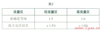 (3)取高、低流量區(qū)中示值誤差絕對值最大的值作為加氣機的示值誤差。準確度等級應符合表2要求。