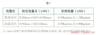 根據(jù)加氣機工作流程,按照加氣機在現(xiàn)場可以達到的最大流量Qmax分為兩個流量區(qū),其檢定流量區(qū)(LNG)Q1、Q2的設定以及實測流量(LNG)見表l的要求。表2為加氣機準確度等級及對應的最大允許的誤差。