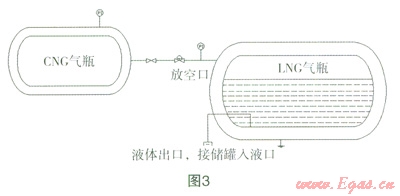 (2)LNG內(nèi)膽主安全閥開啟壓力為1.59MPa(230psi),為了安全起見(調(diào)壓器會出現(xiàn)失效)CNG儲罐充裝壓力不能超過l.59MPa。把CNG與LNG瓶按圖3連接好后都要接上地線。