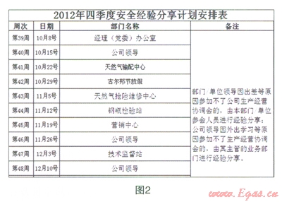 安全經(jīng)驗(yàn)分享活動(dòng)的持續(xù)開展,內(nèi)容的通俗、分享的形式引起員工的共鳴,活動(dòng)得到了大家的認(rèn)可,同時(shí)表達(dá)出分享的愿望。因此,公司安全部門制定《XX季度安全經(jīng)驗(yàn)分享計(jì)劃安排表》,按照分享計(jì)劃,以每周生產(chǎn)協(xié)調(diào)例會(huì)為平臺(tái),公司領(lǐng)導(dǎo)、各部門、單位收集業(yè)務(wù)范圍內(nèi)的HSE素材,主動(dòng)開展安全經(jīng)驗(yàn)分享。(見圖2)