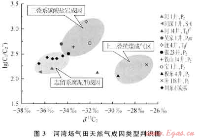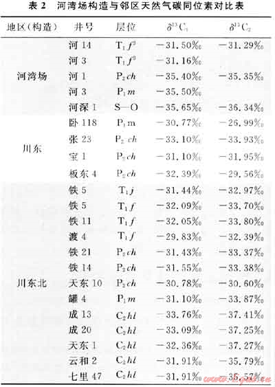 3) 河灣場(chǎng)氣田奧陶系、二疊系地層天然氣δ13C1在-35.65‰~-35.40‰之間,δ13C2在-35.35‰~-36.34‰,乙烷碳同位素明顯低于-34‰,具有典型的腐泥型天然氣特征,與川東和川東北地區(qū)二、三疊系天然氣存在明顯的差別,而與川東北地區(qū)石炭系天然氣乙烷碳同位素大致相當(dāng)。