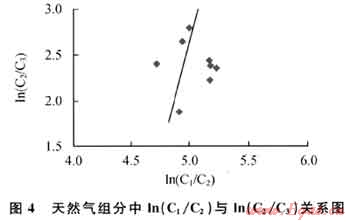 既然河灣場(chǎng)奧陶系、二疊系天然氣與川東石炭系天然氣都來(lái)源于志留系烴源巖,為何甲烷碳同位素差異這么大呢?在天然氣生成過(guò)程中,存在著2種成因的天然氣,即干酪根裂解氣和原油裂解氣。對(duì)于多期成藏的盆地,早期形成的古油藏隨埋深的增大其溫度增高,古油藏中的原油必然要發(fā)生二次裂解而形成天然氣。干酪根裂解和原油裂解形成的天然氣中的C1/C2與C2/C3值完全不同:干酪根裂解所形成的天然氣ln(C1/C2)值變化較大,ln(C2/C3)值變化較小;而原油二次裂解形成的天然氣ln(C1/C2)值變化較小,ln(C2/C3)值變化范圍較大[4~9]。由圖4可見,河灣場(chǎng)氣田的天然氣具有原油二次裂解氣的特征。此外,川西北部地區(qū)經(jīng)歷了古油氣藏的形成及多期成藏過(guò)程,且泥盆系-侏羅系儲(chǔ)層中廣泛分布瀝青也說(shuō)明該區(qū)存在大量原油裂解氣提供了依據(jù)。