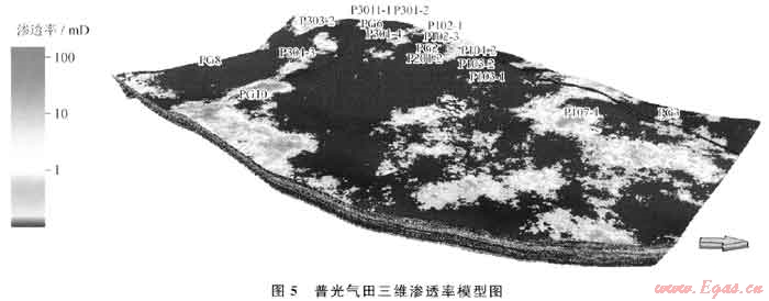 當(dāng)滲透率模型用孔隙度計(jì)算出來(lái)以后,再用裂縫指數(shù)模型作為第2個(gè)變量加權(quán)校正,使?jié)B透率模型比較好地反映裂縫的影響。從最終滲透率模型(圖5)來(lái)看,其整體的數(shù)據(jù)分布特征與孔隙度模型有一定的相似性,同時(shí)又反映了各層面不同孔隙結(jié)構(gòu)類型的滲透率變化特征,在預(yù)測(cè)有裂縫發(fā)育的部位表現(xiàn)出高滲區(qū)沿裂縫呈條帶狀延伸的特點(diǎn)。