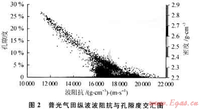 地震資料的優(yōu)勢(shì)在于能夠提供遠(yuǎn)離井點(diǎn)的儲(chǔ)集層信息.但該數(shù)據(jù)體是否能用于約束儲(chǔ)集層參數(shù)建模,還需要進(jìn)一步分析其與儲(chǔ)集層物性參數(shù)的相關(guān)性,只有兩者相關(guān)性好,方可用地震資料反演約束建模。選擇何種地震屬性作為約束條件,以及利用地震數(shù)據(jù)體對(duì)何種儲(chǔ)層參數(shù)做約束是這種建模方法中很重要的一個(gè)環(huán)節(jié)。通過(guò)分析認(rèn)為,孔隙度曲線與地震反演波阻抗之間存在良好的負(fù)相關(guān)(圖2),即高孔隙度層段通常都對(duì)應(yīng)于低波阻抗反射波,而低孔隙度層對(duì)應(yīng)于高波阻抗。