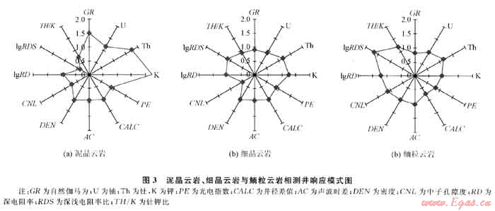 由于取心資料有限,要深入研究巖相特征,需要利用測(cè)井資料來實(shí)現(xiàn)。其基本原理主要是:不同沉積環(huán)境形成的巖石類別,其礦物成分、結(jié)構(gòu)、構(gòu)造等存在差異,導(dǎo)致地球物理屬性的差異,可在各種測(cè)井系列上出現(xiàn)差別響應(yīng),因而可根據(jù)各種測(cè)井信息的集總,建立各類巖相測(cè)井響應(yīng)歸一化模式庫(kù)(圖3)[3]。