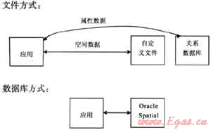 在這兩種方式中間形成了一種過(guò)渡方式:即建立一個(gè)同關(guān)系數(shù)據(jù)庫(kù)的中間處理平臺(tái),比如MapInfo的SpatialWrae產(chǎn)品,通過(guò)它將空間數(shù)據(jù)庫(kù)存放在關(guān)系型數(shù)據(jù)庫(kù)中。