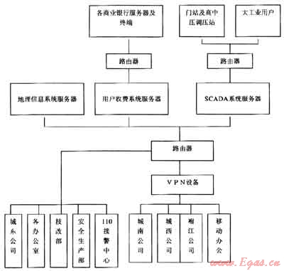 硬件網(wǎng)絡(luò)以地理信息系統(tǒng)服務(wù)器、用戶(hù)收費(fèi)系統(tǒng)服務(wù)器和SCAD系統(tǒng)服務(wù)器為核心,采用一條50M和一條8M專(zhuān)用光纜與電信運(yùn)營(yíng)商連接,50M光纜分兩區(qū),其中16M帶寬用于收費(fèi)服務(wù)器與8家聯(lián)網(wǎng)收費(fèi)銀行聯(lián)系傳遞信息,34M帶寬用于辦公網(wǎng)絡(luò)上互聯(lián)網(wǎng)和燃?xì)饩C合管理系統(tǒng)、用戶(hù)收費(fèi)系統(tǒng)、SCAD系統(tǒng)通過(guò)VPN設(shè)備與遍布市區(qū)的東南西北四個(gè)分公司及營(yíng)業(yè)服務(wù)廳聯(lián)網(wǎng)。8M光纜專(zhuān)門(mén)用于與各SCAD系統(tǒng)遙測(cè)遙控點(diǎn)數(shù)據(jù)傳輸和與集團(tuán)公司SCAD控制中心數(shù)據(jù)交換(通過(guò)互聯(lián)網(wǎng))。