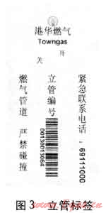 依據(jù)立管管徑的不同,使用不同規(guī)格的立管標(biāo)簽。標(biāo)簽上含有燃?xì)夤痉?wù)熱線、立管編碼的條形碼、燃?xì)夤拘畔ⅰ⒕菊Z(yǔ)等。目前公司已在轄區(qū)的居民小區(qū)內(nèi)試用,先將各立管信息打印于立管標(biāo)簽,再將立管標(biāo)簽粘貼于立管上。