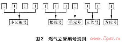 為了更好地對(duì)立管進(jìn)行管理,對(duì)立管進(jìn)行有規(guī)則的編號(hào)顯得非常必要。編號(hào)可與客服管理系統(tǒng)相結(jié)合,公司依據(jù)客服管理系統(tǒng)以及立管情況進(jìn)行編號(hào)。燃?xì)饬⒐芫幪?hào)規(guī)則見(jiàn)圖2。