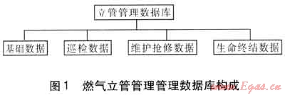 燃?xì)饬⒐芄芾硎且匀細(xì)庖牍軘?shù)據(jù)為基礎(chǔ)的。我們?cè)诔鞘忻裼萌細(xì)饬⒐艿墓芾眄?xiàng)目實(shí)施前以及實(shí)施過(guò)程中收集了大量的基礎(chǔ)數(shù)據(jù),以此建立基礎(chǔ)數(shù)據(jù)庫(kù);依據(jù)在運(yùn)行過(guò)程中因管道日常巡查、維修、更換、事故搶修等而產(chǎn)生的運(yùn)行數(shù)據(jù),建立運(yùn)行數(shù)據(jù)庫(kù)。通過(guò)開(kāi)發(fā)專業(yè)的立管管理軟件將上述兩個(gè)數(shù)據(jù)庫(kù)資源進(jìn)行整合,形成一個(gè)完整的燃?xì)饬⒐芄芾頂?shù)據(jù)庫(kù)。工作人員運(yùn)用該專業(yè)管理軟件對(duì)基礎(chǔ)數(shù)據(jù)、日常巡查數(shù)據(jù)以及維護(hù)、更換、事故搶修事故數(shù)據(jù)進(jìn)行處理、分析,得出分析結(jié)果,依據(jù)分析結(jié)果采取相應(yīng)的響應(yīng)措施,并將數(shù)據(jù)進(jìn)行更新,不斷補(bǔ)充、完善整體數(shù)據(jù)庫(kù)[2]。立管管理數(shù)據(jù)庫(kù)系統(tǒng)構(gòu)成見(jiàn)圖1。